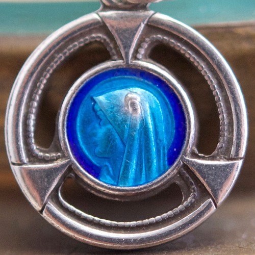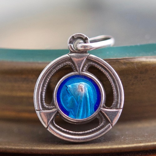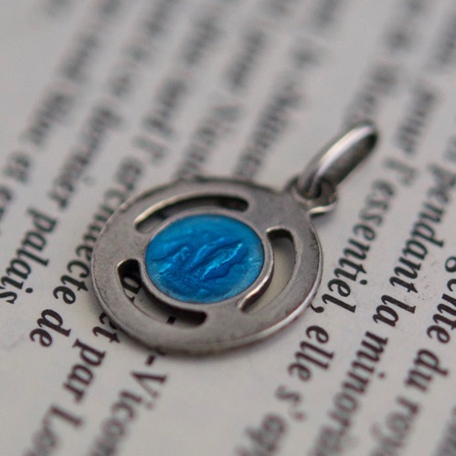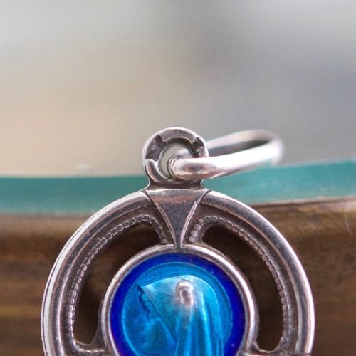 このメダイは20世紀中頃の古いものですが、表面のブルーのエマイユの欠け以外はとても綺麗な状態です。欠け部分を触ったりしない限り欠けが広がることはありませんが、気になる方は購入後透明なマニュキュアを塗って保護するといいかもしれません。そのため、特別価格でのご提供と成ります。ただ古いものには変わりありませんので、サイトでお伝えできない細かい点があることもご理解ご了承ください。